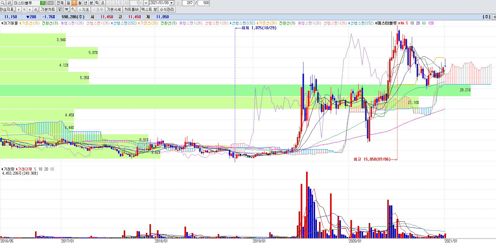 웹툰관련주 미스터블루 주봉챠트