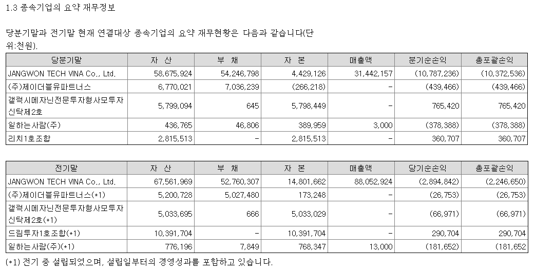 장원테크 연결매출액의 대부분을 차지하는 장원테크 비나. VINA 인것을 보니 베트남 법인 같은데요. 그래도 19년도까지는 꽤 괜찮은 영업이익을 보여주었는데, 최근 급격하게 손실이 나고 있습니다. 위에 표가 올 3분기 영업실적인데요. 올해 약 -100억원의 분기순손실을 기록 했습니다. 이런식이라면 기존에 장원테크가 연결기준으로 가지고 있던 년평균 1천억원의 매출액이 올해는 약 500억원 수준이 될것으로 보여 반토막이 예상 됩니다.