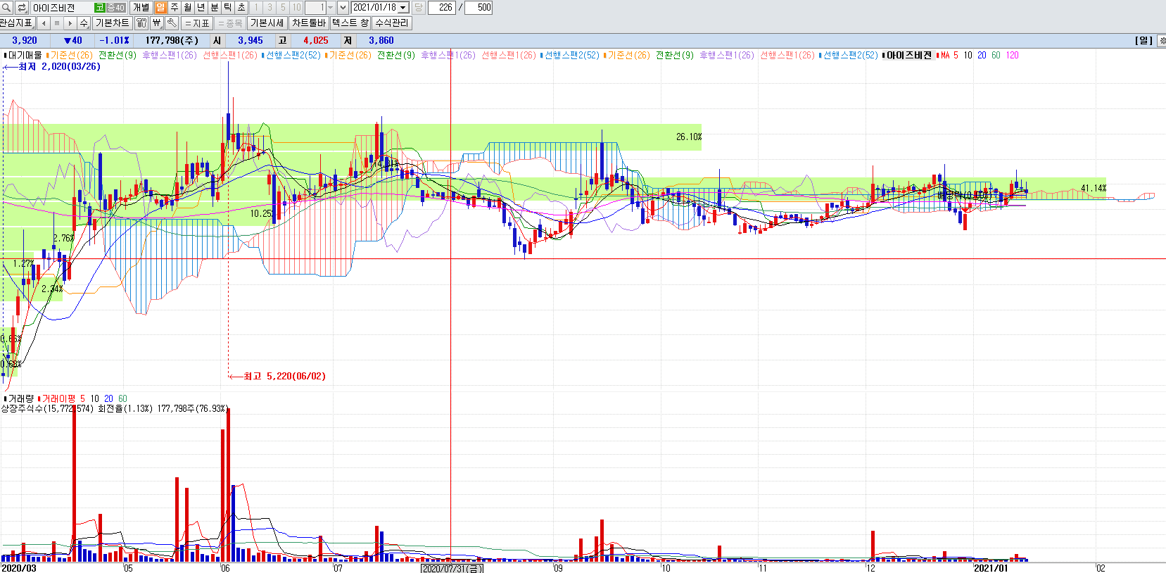 5G관련주 테마주 아이즈비전 일봉챠트