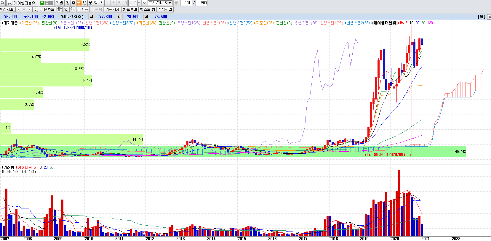 5G관련 대장주 케이엠더블유 월봉챠트