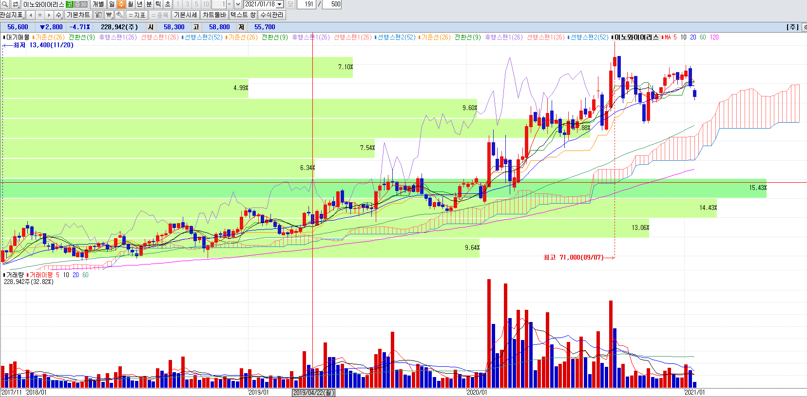 5G관련주 이노와이어리스 주봉챠트