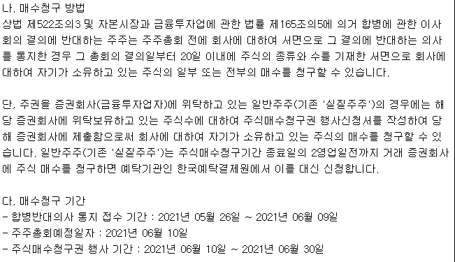 주주들은 금호에이치티와 다이노나간 합병에 반대하는 의견을 회사에게 표시할 수 있는데요. 이를 합병반대의사통지라고 합니다. 이번 두 회사의 합병에 반대하는 의견을 내는 기간은 21년 5월 26일부터 21년 6월 9일까지 입니다. 합병에 반대하는 분들께서는 서면으로 회사에 합병반대의사를 표시한다면 회사는 합병반대의사를 표시한 주주의 주식을 매수해줘야 합니다. 이를 주식매수청구권이라고 하는데요.