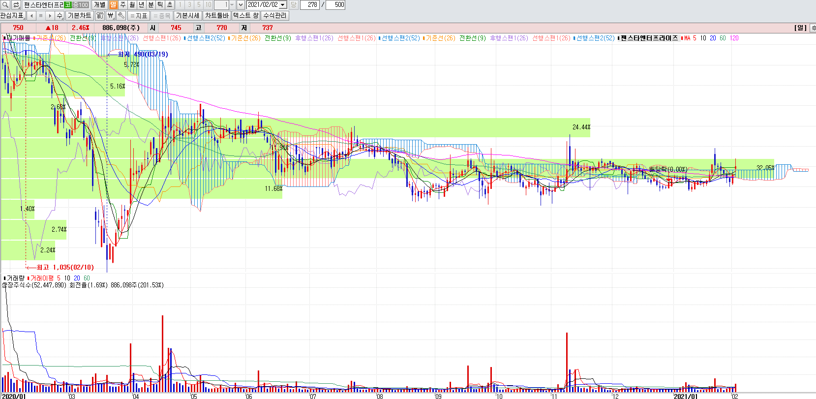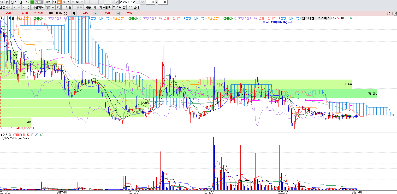 팬스타엔터프라이즈의 일봉챠트 입니다. 코로나19로 인해 한국증시 초토화때 이평선 이격이 크게 벌어졌다가 1년가까히 거래량 죽인채 횡보중에 있습니다. 중간중간 물량테스트로 거래량이 터진게 보이고요. 1년간 다른 종목들이 크게 오를 때 상승한바가 없습니다. 이평선이 응집하고 큰 시세가 나오기 마련 인데요.