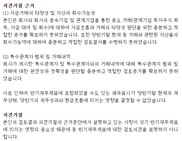 또한 감사인이 지적한 특수관계인과 그외 자산의 투자에 대한 회사부분에 대하여 정확히 소명하지 못하면 이번 3월 감사보고서 시즌에 의견거절을 맞을수 있습니다. 반기보고서의 의견거절은 관리종목 지정사유지만, 사업보고서의 의견거절은 즉시 거래정지 후 상장폐지 실질심사 돌입 입니다.