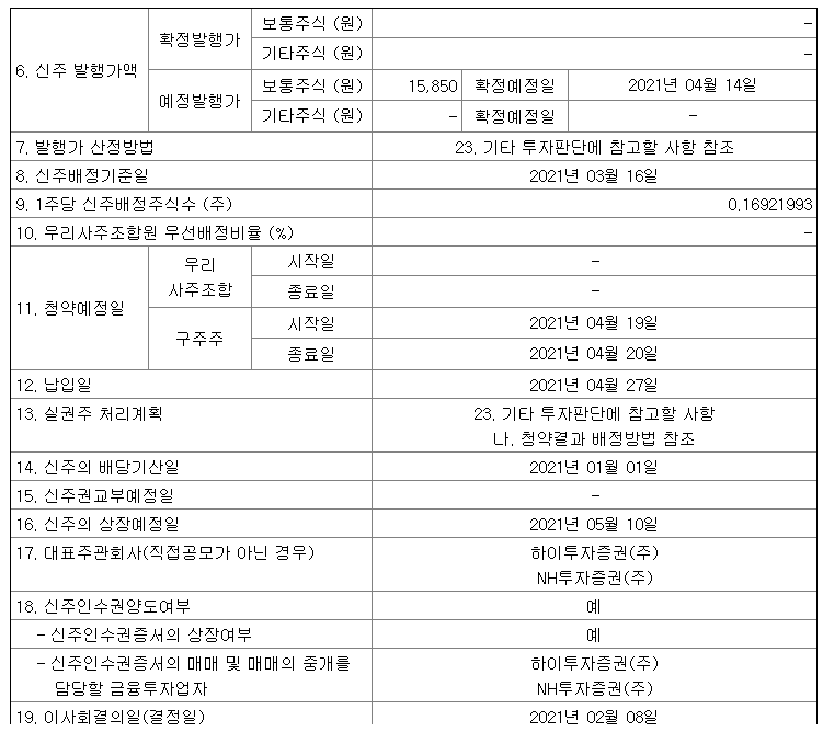 다원시스 신주의 예정발행가는 주당 15,850원이며, 확정가는 21년 4월 14일에 결정되게 됩니다. 최근 씨에스윈드나, 포스코케미칼의 경우 유상증자 이후 주가가 되려 급등하여 더 많은 규모의 자금을 조달할 수 있었습니다. 때문에 확정발행가가 나올 때까지 주가가 어떻게 움직이느냐 잘 체크하셔야 하겠습니다.