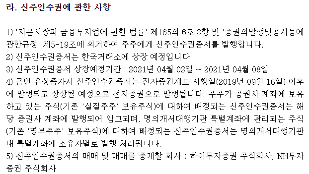 위 표에 보시면 3)신주인수권증서 상장예정기간이라 하여 21년 4월 2일부터 4월 8일 5거래일간 자유롭게 매매가 가능 하십니다. 어쨋든 난 내게 배정받은 주식만 청약하겠다 하시는 분들은 이 기간도 그냥 무시하고 지나치시고 청약예정일 전에 내가 가진 다원시스12R * 확정발행가만 증권계좌에 현금으로 가지고 계시다가 청약신청 하시면 됩니다.