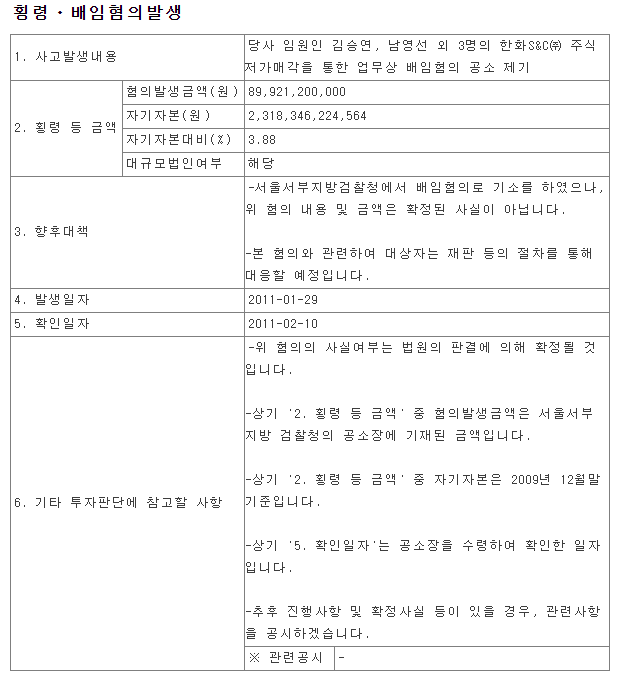 과거 비슷한 대기업집단인 한화도 김승연 회장의 횡령에 따른 거래정지를 당한 적이 있습니다. 2012년도 였는데요. 한화 김승연 회장외 임원 3명이 약 899억원을 횡령하면서 한화가 거래정지를 맞는 초유의 사태가 발생한 적이 있었습니다. 당시에 자기자본의 3.88%로써 거래정지가 되면서 상장폐지 실질심사 대상이 된것 인데요.