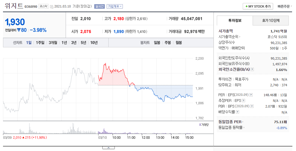 비트코인 관련주 대장주 위지트는, 앞서 설명한 빗썸코리아 지분을 8% 갖고있는 비트코인 관련주로 부각중인 티사이언티픽(구 옴니텔)의 최대주주라는 이유로 시장에서 비트코인 관련주 대장주로 부각되고 있습니다. 시가총액 1700억원대의 중소형주로써 디스플레이 반도체장비를 부품 생산하는 업체입니다. 자본금 대비 자본총계의 비율이 썩 좋지는 않으나 그렇다고 상장폐지나 관리종목 요건에 해당하는 수준은 아닙니다.