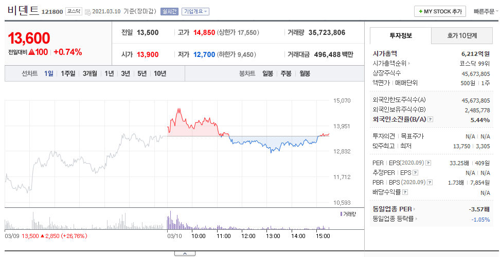 비트코인 관련주 대장주 비덴트는 빗썸홀딩스 지분율 34%와 빗썸코리아 지분율 10%를 가져 시장에서 비트코인 관련주 대장주로 부각되고 있습니다. 시가총액은 오늘 장종료 기준 6200억원대이며 재무적인 문제는 크게 없어 보입니다.