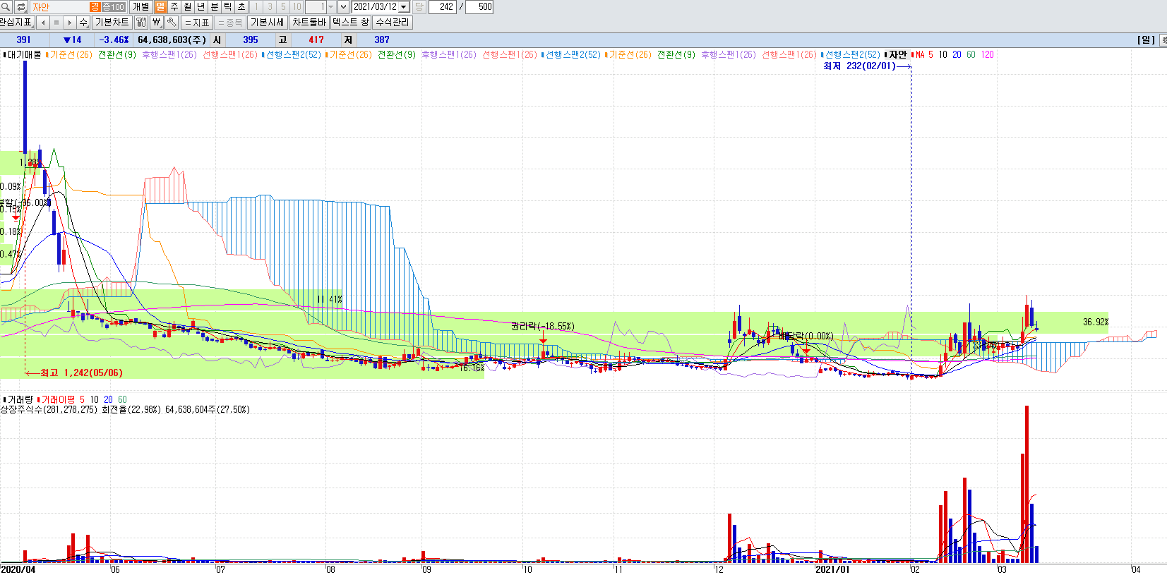 자안그룹과 자안의 합병은 21년내 진행할 것으로 보고 있습니다. 저 뿐만 아니라 다수의 전문가들의 의견 역시 그러한데요. 거래량이 붙고 투자경고 딱지를 붙은 지금 매수에 동참하기 보다는 거래량이 급감하고 투자경고 딱지가 떨어졌을 때 분할매수에 들어가는것이 좋다고 보여집니다. 투자는 반드시 본인 책임이니 참고하시구요.