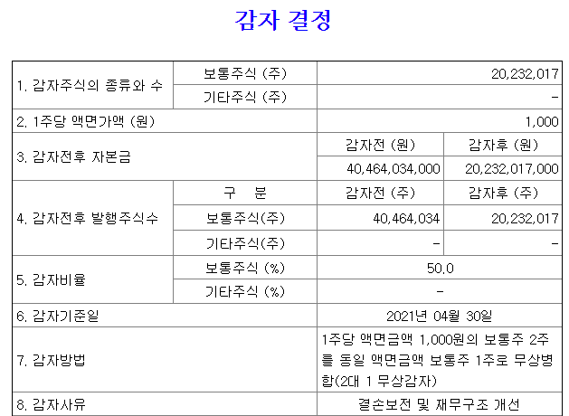 쌍용정보통신은 18년도 정부를 상대로한 소송에서 패소하여 자본금이 자본총계보다 커져서 자본잠식에 빠진것 입니다. 급격히 부채가 늘어나면서 자본총계가 확 줄어버리니, 가뜩이나 400억원이나 되는 자본금을 가지고 있어 쉽게 자본잠식에 빠지게 된것 이죠. 이 자본금을 줄여버리는게 바로 감자라고 하는 겁니다. 자본을 감소시킨다를 줄인 말 입니다. 유상감자와 무상감자가 있는데, 유상감자는 자본을 줄이는 대신 주주들에게 보상을 하는것이고 무상감자는 주주들에게 아무런 보상없이 회사 이사회 결정으로 진행해버리는것 입니다. 그러니 당연 무상감자는 악재가 맞죠. 왜냐면 님들께서 10000만주를 가지고 있다면 강제로 5천주로 줄여버리는 것 입니다. 아무런 보상없이 말입니다. 그럼 내가 언제까지 주식을 들고 있으면 감자를 당하게 되느냐? 라고 질문하실 수 있습니다. 바로 아래 공시내용중 기준일을 보시면 됩니다.