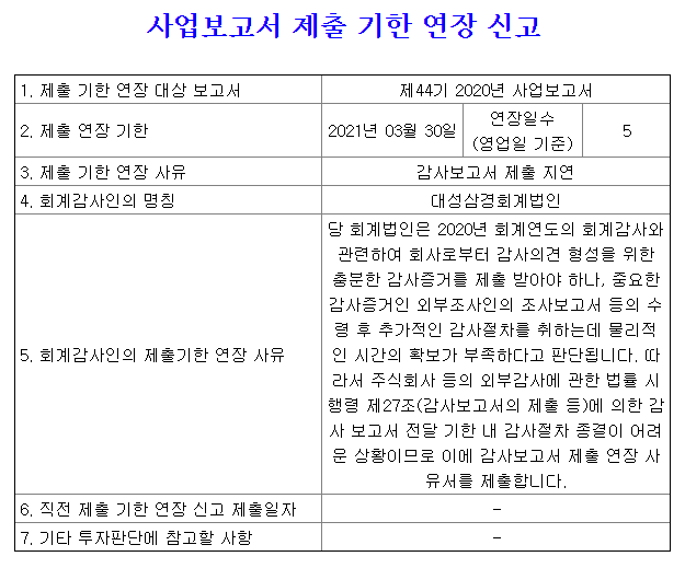만약 회사가 감사보고서의 제출이 지연될 것 같다고 하면 거래소에 사업보고서(감사보고서)의 제출지연 신고를 해야 합니다. 언제까지 제출하겠다는 것까지 말입니다. 그만큼 사업보고서(감사보고서), 분기, 반기보고서의 제출기한은 매우 중요 합니다.