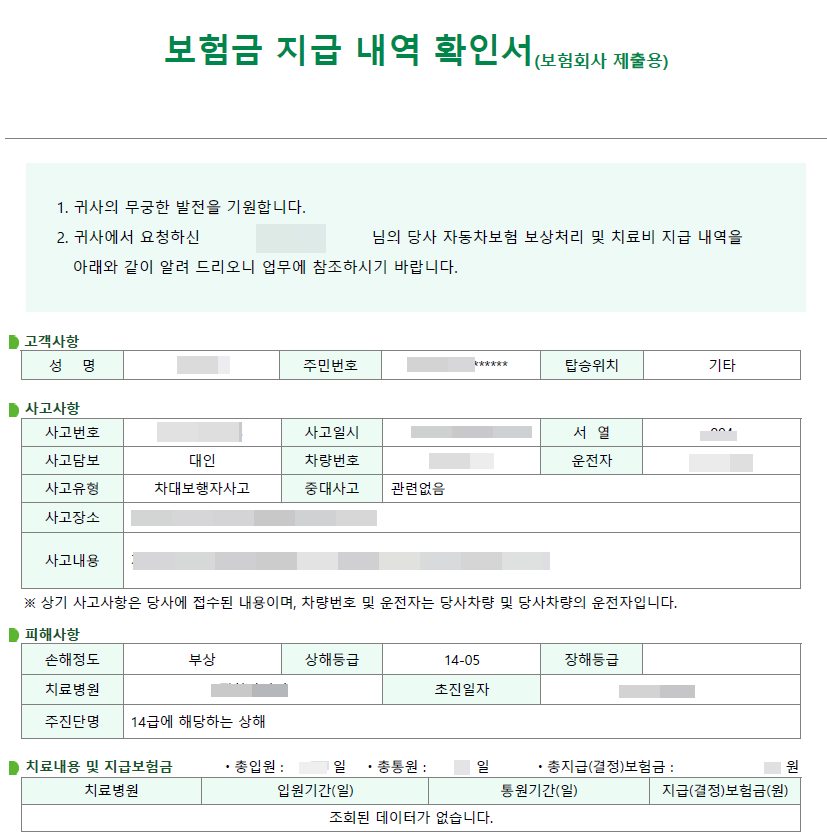 위 문서는 제 고객님의 교통사고로 인한 지급결의서 입니다. 가해자측 보험사가 DB손해보험이어서 DB손해보험측에서 보내준 지급결의서 인데요. 상대방 대인담당자에게 요구하면 메일이나 팩스로 송부해 줍니다. 이 사고는 보행중 일어난 사고 였는데요. 경미한 사고여서 상해등급이 14급이 나왔습니다. 고객님은 14급 50만원 한도(최대한도)로 가입하셨기 때문에 50만원을 받으실 수 있는 것 입니다.
