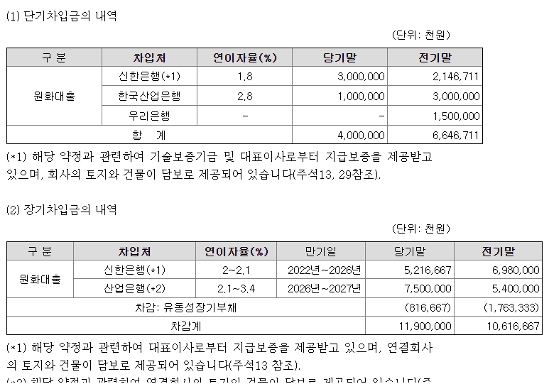 회사가 단기차입금이 매우 높다면 반드시 의심해봐야 합니다. 단기차입금은 회사 부도와 직결이 됩니다. 연이자율은 얼마인지, 1금융권에서 빌린게 맞는지 의심해보고 꼼꼼히 살펴야 합니다. 엠플러스의 장단기 차입금은 모두 양호합니다. 저리의 이자를 산업은행과 1금융권인 신한은행에서 잘 사용하고 있네요. 제가 예전에 이자 15%짜리 대출을 2금융권에서 받은 회사도 봤습니다. 결국 어떻게 됐을까요? 굳이 설명을 안드려도 아실거라 생각 합니다.