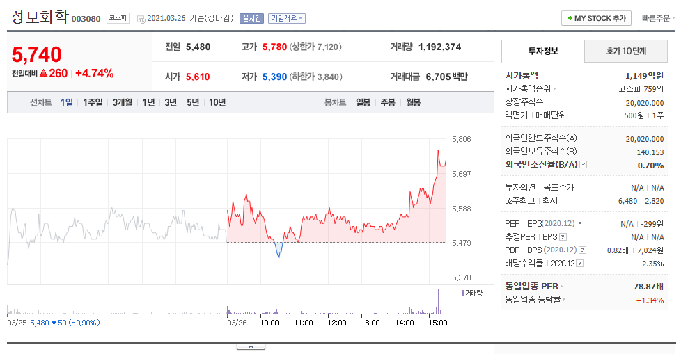 성보화학은 최대주주인 윤정선씨가 파평윤씨 종친회로 알려지면서 시장에서 파평윤씨 윤석열 관련주 테마주로 부각되고 있습니다. 코스피 상장사로써 시가총액은 1100억원이고 2.3%의 배당성향을 보여주고 있습니다. 2년연속 적자이긴 하나 아주 낮은 부채비율이 인상적 입니다.