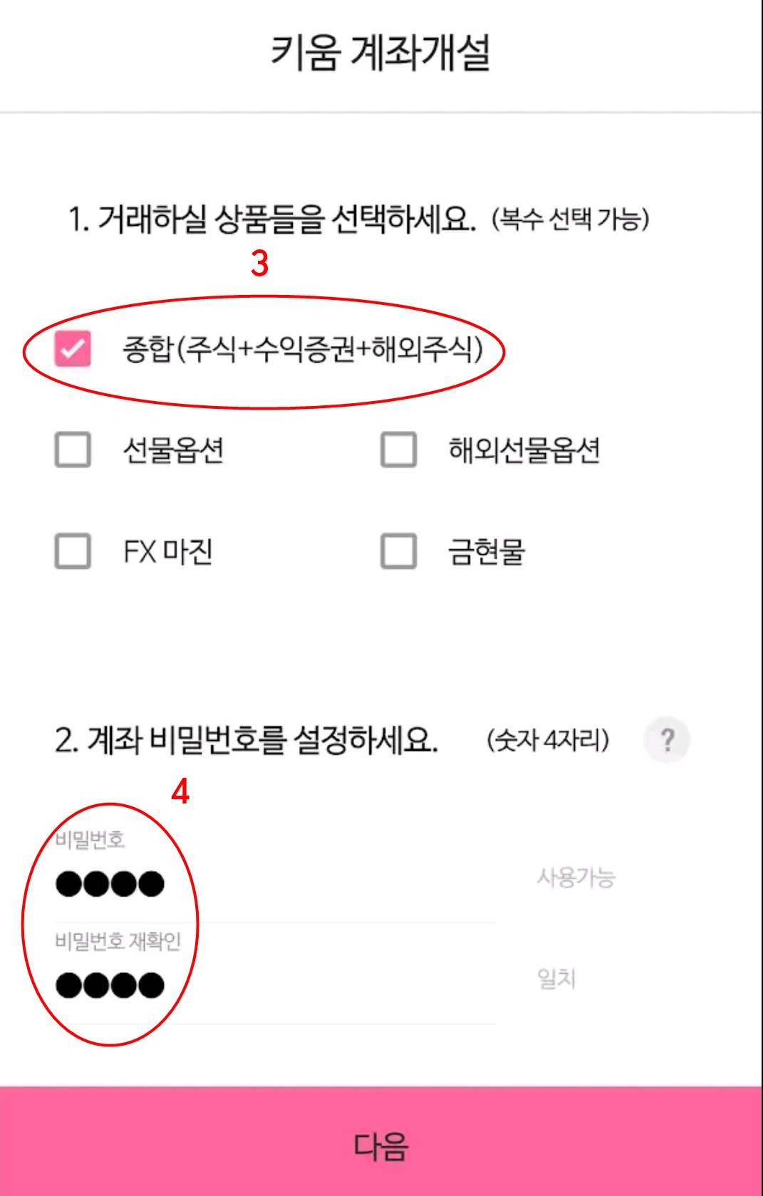 계좌개설을 위해 어떤 형식의 계좌를 만들것인지 정해주세요. 대부분 주식거래를 위해서 종합계좌로 하실것이니 종합계좌를 선택해 주십니다. 그리고 아래 비밀번호를 설정해 주십시오. 비밀번호까지 설정하셨다면 아래 다음을 눌러 줍니다.