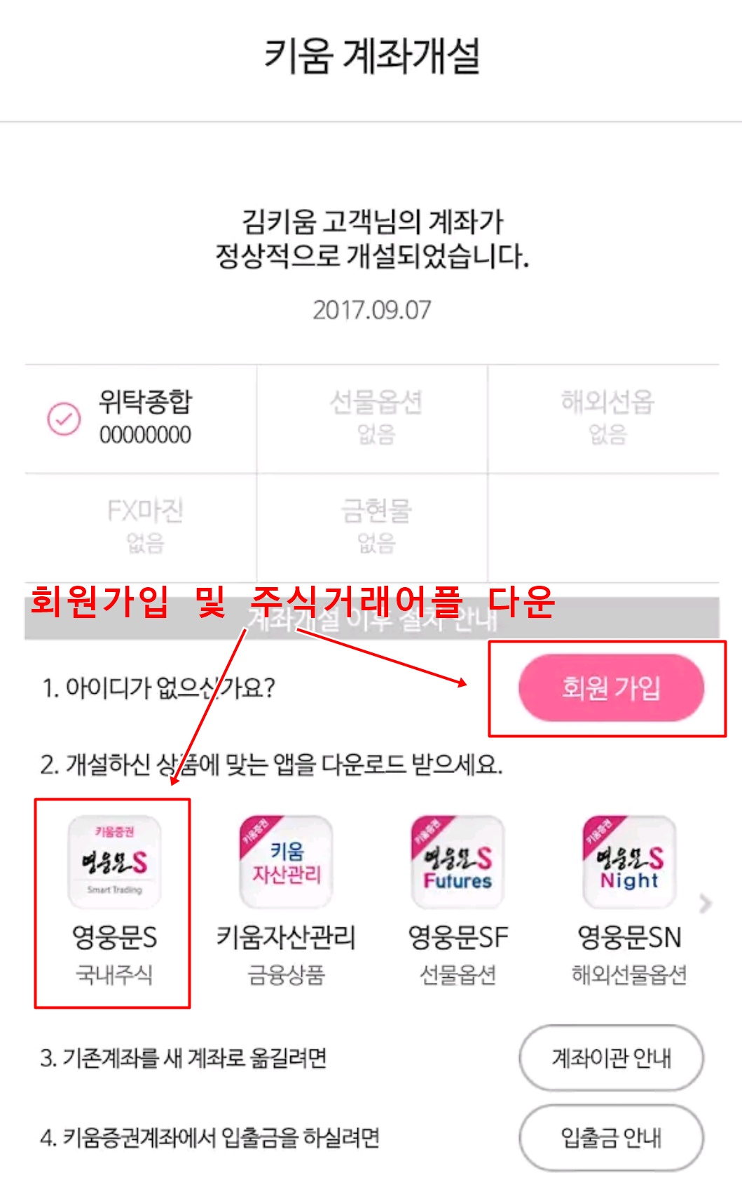 이렇게 되면 주식계좌 개설이 완성이 된것 입니다. 더불어 회원가입을 반드시 해주시고(추후 공동인증서 갱신등에 필요) 주식거래를 위한 어플을 다운받아 줍니다. 지금까지 하신것은 오직 계좌개설을 위한 어플이었으니 이제 주식 거래용계좌 어플을 받아야 겠죠? 이렇게 되면 증권계좌 주식계좌 개설이 끝이 난것 입니다.