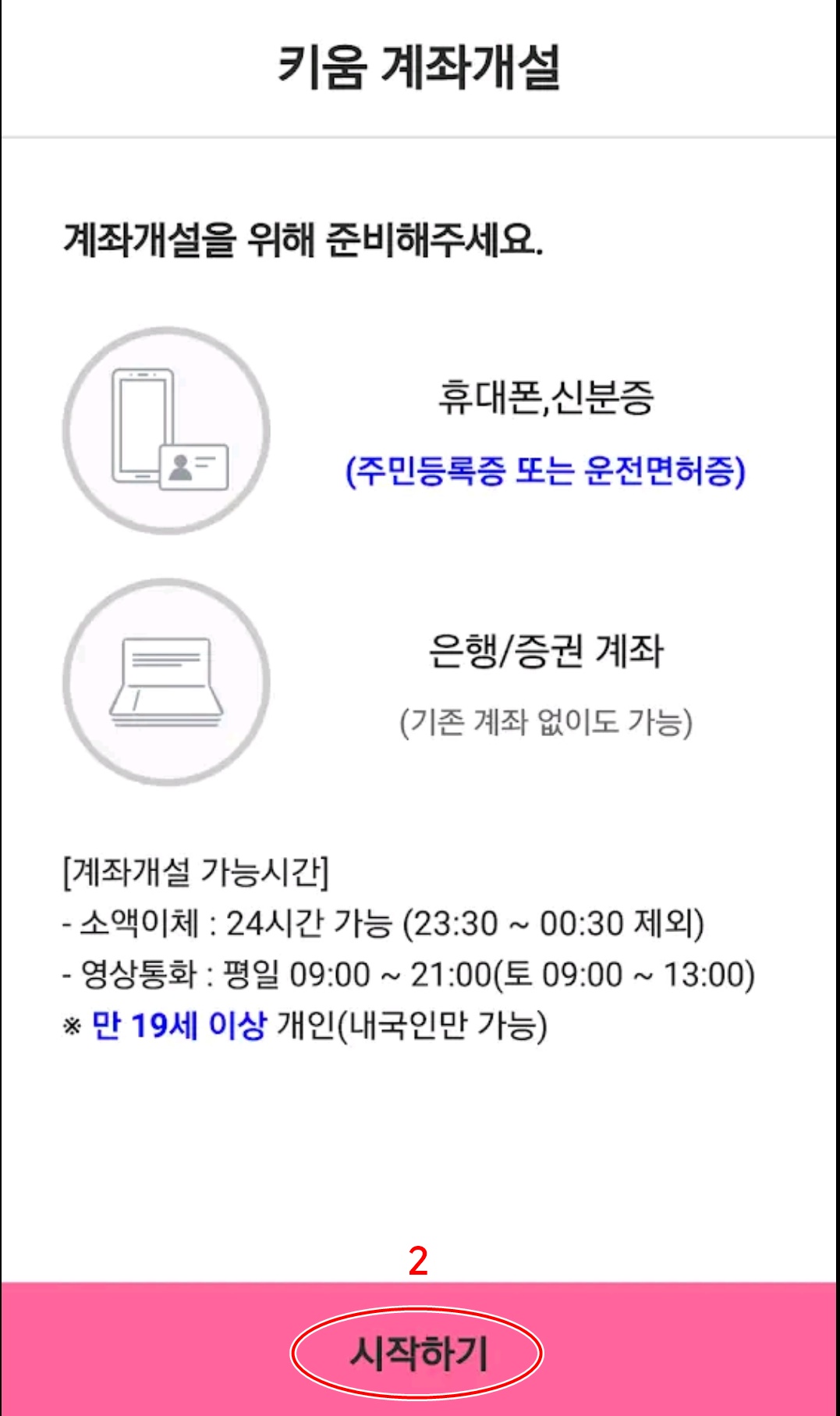 위와 같이 준비물이 모두 준비가 되셨다면 아래 시작하기 버튼을 눌러 주십니다. 입출금통장이 없거나 은행어플이 없어서 증권사로부터 본인확인 입금에 대한 확인이 어려울땐 영상통화로도 가능하지만 평일 9시부터 21시까지만 가능 합니다.