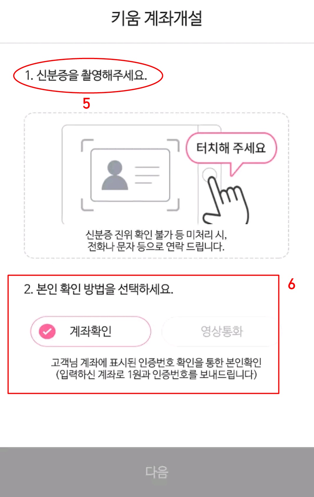 이제 신분증을 스마트폰으로 촬영해야 하는데요. 너무 어둡거나 너무 밝은곳에서는 잘 찍히지 않으니, 적당한 곳에서 촬영해 주십시오. 또한 카메라가 신분증을 찍고 주민번호나 면허번호를 인식을 하는데 인식이 잘 안될수도 있으니, 촬영후에 내 정보들이 모두 맞게 찍혔고 또 인식을 했는가 확인해 주십시오. 그리고 본인확인 방법을 선택해 주세요. 영상통화보다는 계좌확인이 더 편하고 수월하니 계좌확인을 체크하시고 다음을 눌러 주세요.