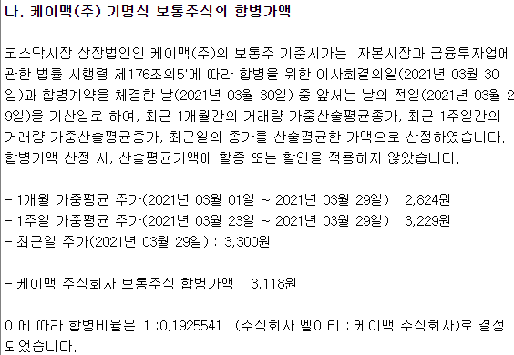 엘이티와 케이맥 두 회사는 모두 코스닥 상장법인 입니다. 따라서 합병발표일 직전 한달간의 평균 주가를 계산하여 합병가액을 산정하게 됩니다.