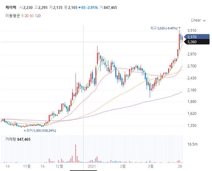 또한 케이맥의 주가는 그동안 3배이상 급등을 했고 엘이티의 주가는 바닥에서 횡보중이기 때문에 합병시너지를 톡톡히 볼 수 있을것이라는게 저의 개인적인 생각입니다.