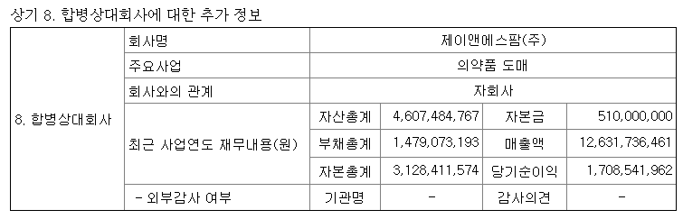 제이앤에스팜은 의약품 도매상 입니다. 마찬가지로 부채의 비율이 굉장히 좋으며 120억원의 매출액과 17억원의 당기순이익을 보여주고 있습니다. 이 역시도 100% 지분을 가지고 흡수합병 하였기 때문에 2분기부터 우리들휴브레인 실적에 그대로 반영이 될겁니다.