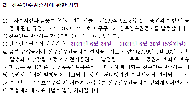 앞서 말씀드린대로 6월 4일 종가까지 우리들휴브레인 보통주를 보유한 분들께는 우리들휴브레인 21R이란 이름으로 신주인수권이 본인 증권계좌로 입고가 되실겁니다. 우리들휴브레인21R 신주인수권의 거래기간은 21년 6월 24일부터 30일(5영업일)간 이며 우리들휴브레인21R 신주인수권 거래기간 직전에 증권계좌로 우리들휴브레인 21R 이 입고가 되실겁니다.