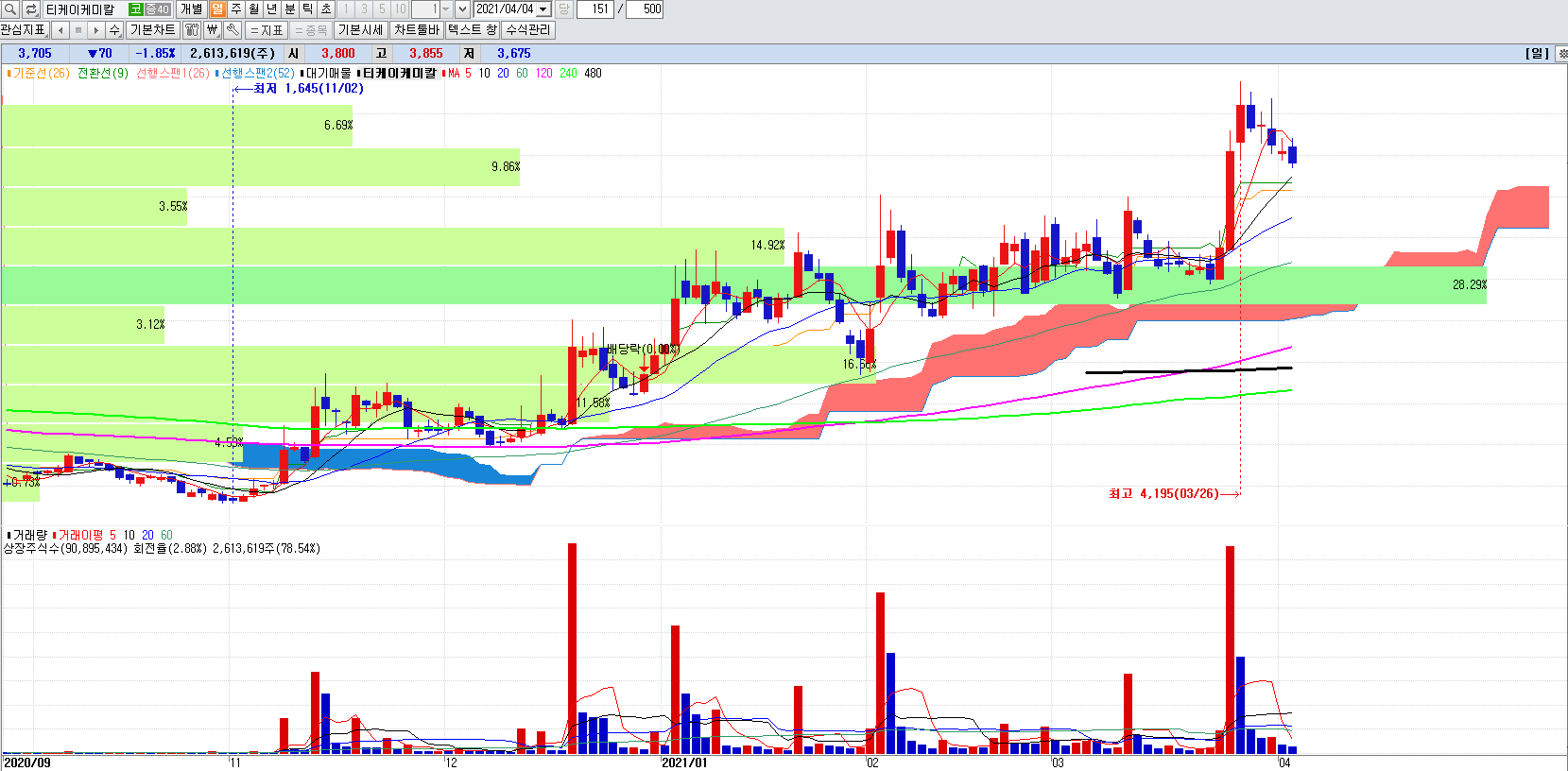 티케이케미칼은 20년도 11월부터 5달간 유통주식의 2배가량의 거래량이 터졌습니다. 거래량은 절대로 속일수가 없습니다.