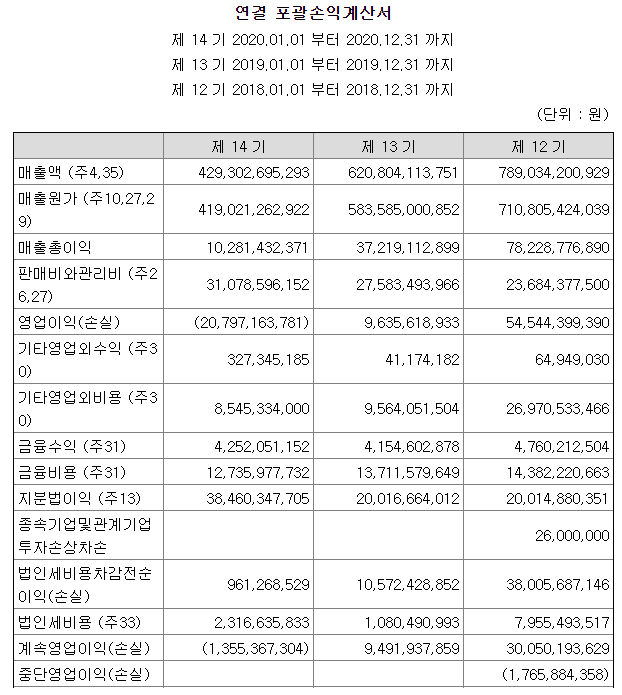 전년도 6천억원의 매출액은 올해 많이 줄어 작년 기준 4300억원의 매출액을 만들었고 영업이익 역시 적자로 돌아 섰습니다. 또한 배당금을 주지 않고 있으며 부채비율은 154%에 달합니다.