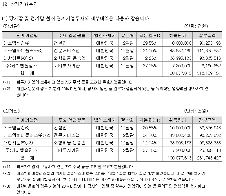 위 공시는 티케이케미칼의 이번 사업보고서서중 관계기업의 투자 내용 입니다. SM상선이 속해 있는 대규모기업집단의 대표회사는 티케이케미칼 입니다. 사업보고서말 SM상선의 지분율은 29.55%이며 취득원가는 100억원, 장부금액은 900억원 입니다. 즉 현재 900억원의 평가를 받고 있는것 입니다. 전기말에는 SM상선의 장부금액이 590억원 이었는데 올해 거의 80% 가량의 지분가치가 증가한 것입니다.