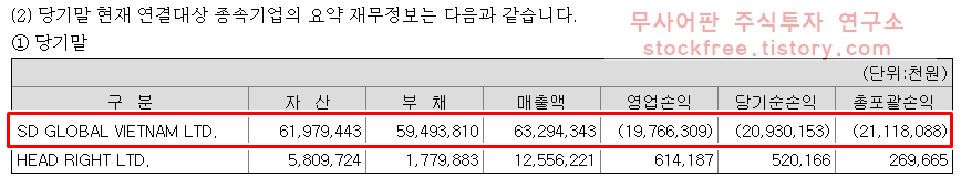 당기말 630억원의 매출액에 -190억원의 영업적자를 기록 했습니다. 자산이 620억원, 부채가 594억원으로써 이번 LG의 영업중단으로 인하여 다음분기에 자본잠식에 빠질 확율이 매우 큽니다. 또한 SD 글로벌 베트남을 제외한 육일씨엔에쓰의 별도 재무제표를 보면 아마 2분기~3분기에 자본잠식이 시작될 가능성이 매우 큽니다. 왜냐하면 사업년도말 기준 58억원의 자본금과 87억원의 자본총계 이기 때문 입니다. 누적 결손금은 -220억원에 달합니다(별도재무제표 기준).