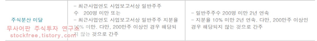 마찬가지로 좌측의 주식분산기준미달로 관리종목으로 지정되고 2년연속일시(그다음해에도 개선이 안될 시) 상장폐지 실질심사에 들어 갑니다.