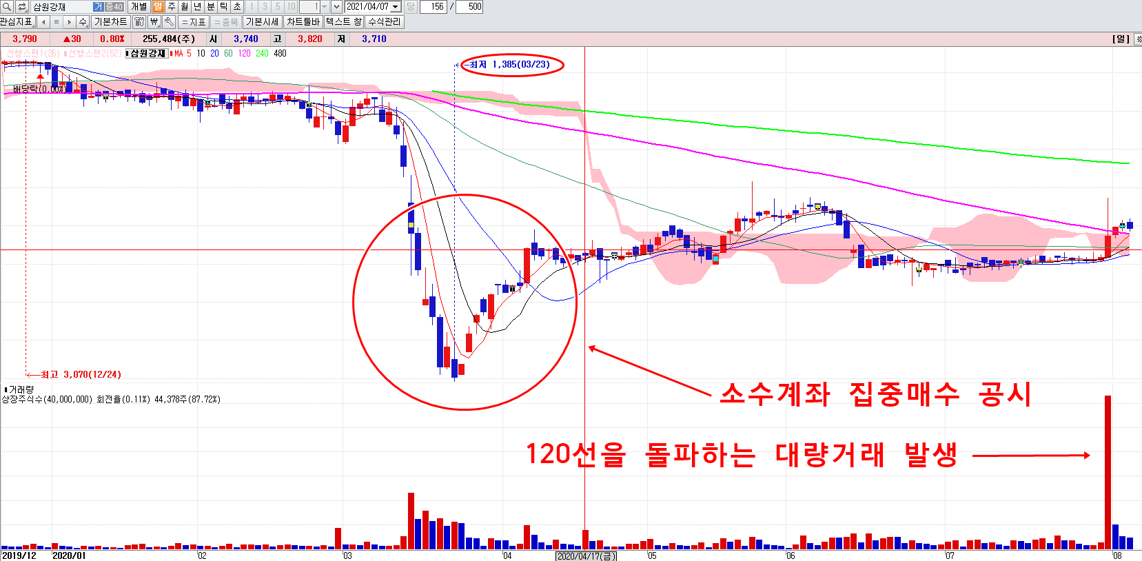 코로나19로 투매가 나왔을 당시 어지간한 종목에서 소수계좌 집중매수 공시가 나왔을 텐데 삼원강재도 예외는 아니었습니다. 기업가치에 비해 주가가 싸지면 큰 손은 한번 물량을 쓸어가게 마련 입니다. 이후 120선을 돌파하는 강력한 수급이 들어옵니다. 투자를 하실 때 120선 밑에 놀고 있던 종목이 120선을 평소 볼수 없었던 거래량을 동반해서 돌파 후 120선 위에 앉아 있으면 무조건 관심종목에 추가하셔야 합니다.