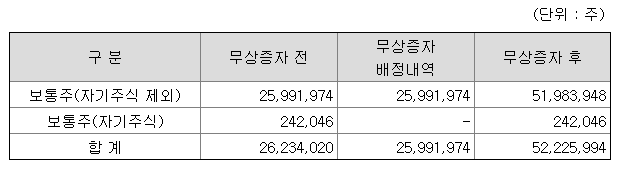 무상증자 이후의 씨젠 보통주 총수는 자기주식을 포함하여 52,225,994주가 될 전망입니다. 자기주식이라 하여 씨젠이란 법인이 소유하고 있는 씨젠의 주식은 의결권이 없는 주식이기 때문에 이는 무상증자 대상에 포함되지 않습니다.