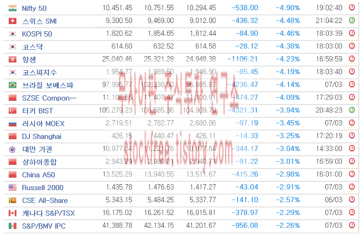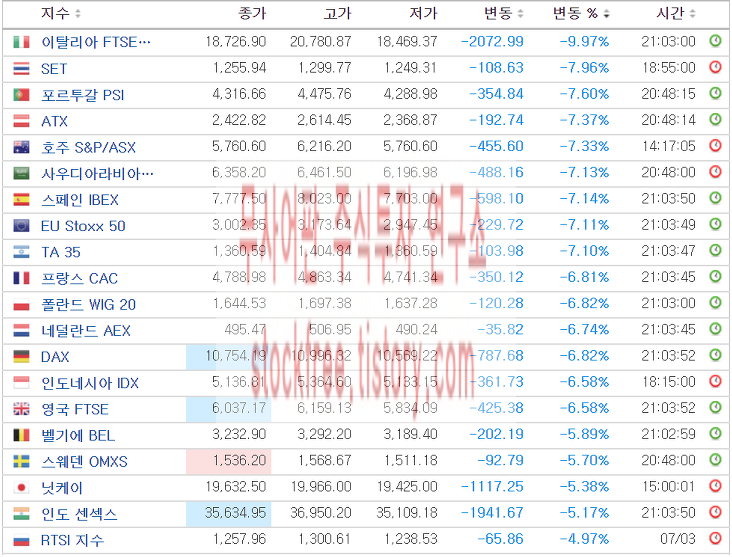 현재 정규장이 진행중인 유럽지수와 더불어 이렇게 유럽 선물지수도 확인하실 수 있습니다. 제가 코로나19가 대유행이었던 20년 3월 9일 세계증시 표를 여담으로 아래에서 보여드리도록 하겠습니다.