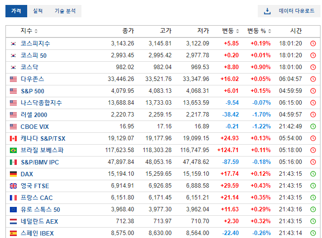 현재시각 기준 우리나라 증시는 마감을 했기 때문에 저 상태이지만, 유럽증시 지표들은 움직이고 있습니다. 미국 뉴욕증시도 글을 쓰고 있는 지금시간에서 +20분뒤에 오픈 하겠네요.