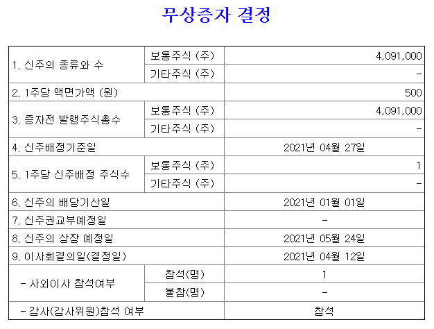 한독크린텍의 현재 발행된 주식의 총수는 4,091,000주 입니다. 여기에 1:1 비율로 한독크린텍 보통주 1주를 가진 이에게 1주의 주식을 증자해주는 무상증자를 발표한것 입니다.