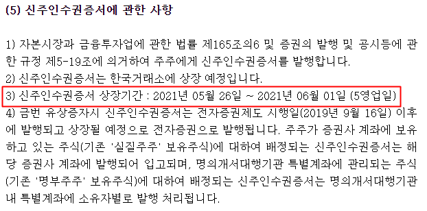 앞서 4월 30일 종가까지 국전약품 보통주를 가지고 계신 분들에 한해 5월 3일 권리락이 발생될것이며, 이때까지 매수를 끝낸 사람들에게 국전약품 신주인수권을 준다고 설명 드렸습니다. 그럼 이 신주인수권은 언제 내 계좌로 들어오는것일까요? 바로 아래와 같은 기간 입니다.