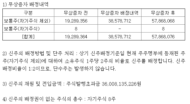현재 에이트원의 발행주식은 총 1928만주 입니다. 여기에 3857만주를 추가 발행하여 1:2 비율의 무상증자를 실시 하는것 입니다. 신주의 발행 재원은 에이트원의 주식발행초과금 약 360억원을 사용하는것이기 때문에 주주분들께서 추가로 납입해야할 현금은 없습니다.