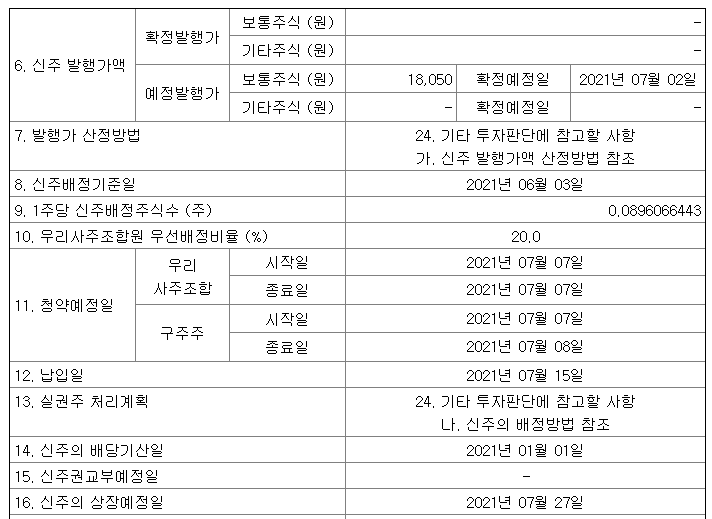 보령제약의 유상증자 예정발행가는 18,050원 입니다. 그러나 최종 발행가는 21년 7월 2일 결정되어 공시될 예정 입니다. 대충 예정발행가를 통해 얼마의 현금을 준비해야 겠다 라고 계산하고 계시면 될것 같습니다.