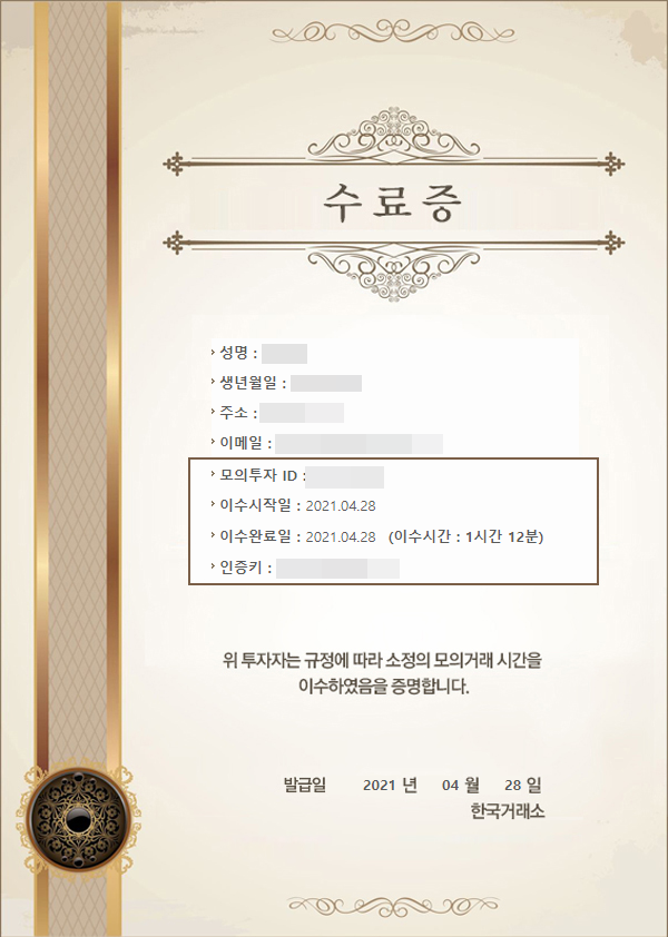 이렇게 수료증에는 개인정보가 간단히 적혀 있으며, 모의투자 ID와 인증키도 나오게 됩니다. 이것을 추후에 본인 증권사에 제출하셔야 개인 공매도가 가능하니 일단 잘가지고 계십시오.