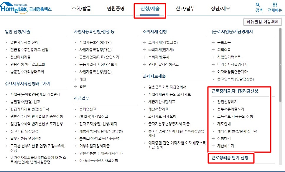 신청 안내 대상자는 홈택스에서 간단하게 근로장려금 신청이 가능 합니다. 아래 홈택스 사이트 링크주소를 남길테니 들어가시고, 회원 가입 후 상단에 신청 제출을 누르시고, 근로장려금 신청을 누르신 후 간편신청하기를 누르시면 간단하게 근로장려금 신청이 가능 합니다.