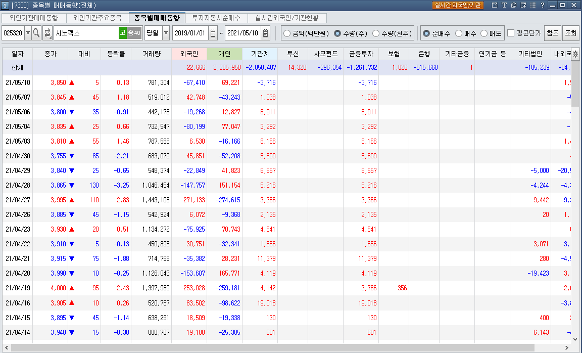 시노펙스는 5월 10일 하루를 제외하고 최근 올들어 기관계(금융투자)에서 지속적인 순매수가 들어와 주고 있습니다. 매매동향중 기관계 매수는 가장 신뢰도가 높은 수급처 입니다. 아래에서 보시죠.