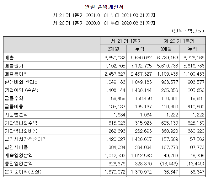 올 1분기 실적은 매출액 9조 6천억원에 영업이익 1조 4천억원을 만들어 냈습니다. 전년도 같은 분기 대비 엄청나게 상승한것이 보이시죠? 이런 추세라면 LG화학이 예상하고 있는 21년도 매출액 41조원과 영업이익 4조 9천억원을 충분히 만들수 있을것이라고 봅니다.