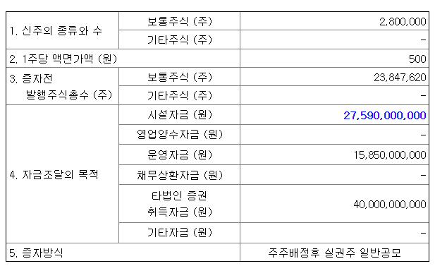 보통 채무상환자금 및 운영자금에 모든 조달대금이 몰려 있다면 이건 회사가 돈이 없다는 것의 반증인데, 유상증자대금을 가지고 시설을 확충한다던가, 타법인증권취득을 통해 사업범위를 확장하는것은 대단히 좋 은 일입니다.