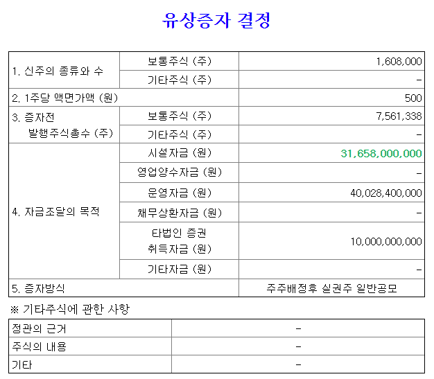 보통 운영자금이나 채무상환자금에 모든 조달된 자금을 전량 사용하는 경우는 유상증자중에서도 악재중에 악재로 분류되는데, 시설확충과 타법인 증권 취득자금에 일부 배정해둔것은 향후 좋은 매출액과 영업이익으로 보답될 것 입니다.