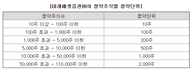 먼저 미래에셋대우는 10주, 100주, 200주 식으로 청약주식별 청약단위가 책정되어 있습니다.