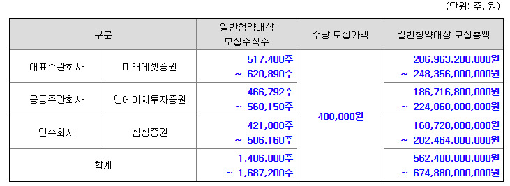 주당모집가액은 기존 45만원대에서 금감원의 정정요구로 인하여 40만원으로 변경 모집공시 하였습니다. 상기 3개 회사에서 청약이 가능하며, 각 회사별 청약대상 모집 주식수는 위와 같습니다.