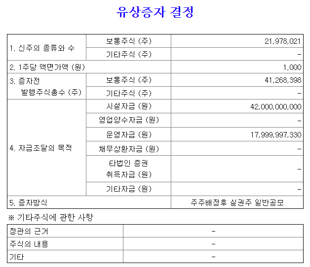 이수페타시스는 현재 4120만주의 주식수를 가지고 있는데, 여기에 2190만주를 신주발행하여 600억원의 자금을 조달하게 됩니다. 600억원중 420억원을 시설자금에 투자하고, 180억원을 운영자금에 사용합니다. 시설자금에 투자한다는것은 향후 높은 매출액으로 보답이 되기 때문에 나쁘다고 볼수는 없습니다.