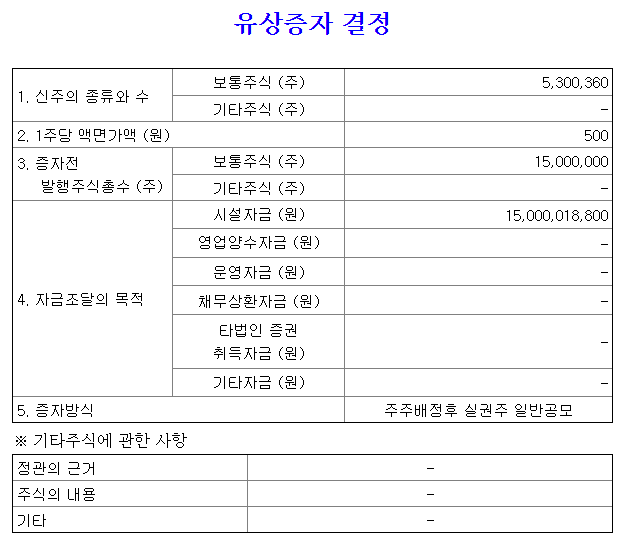 동일제강의 현재 발행주식 총수는 1500만주 인데, 여기에 530만주를 추가 발행하면서 총 150억원의 자금을 조달하게 됩니다. 자금 조달의 목적은 시설자금에 150억원이 전량 사용됨으로써 영업이익 및 매출상승을 위한 자금조달이라 할 수 있겠습니다.